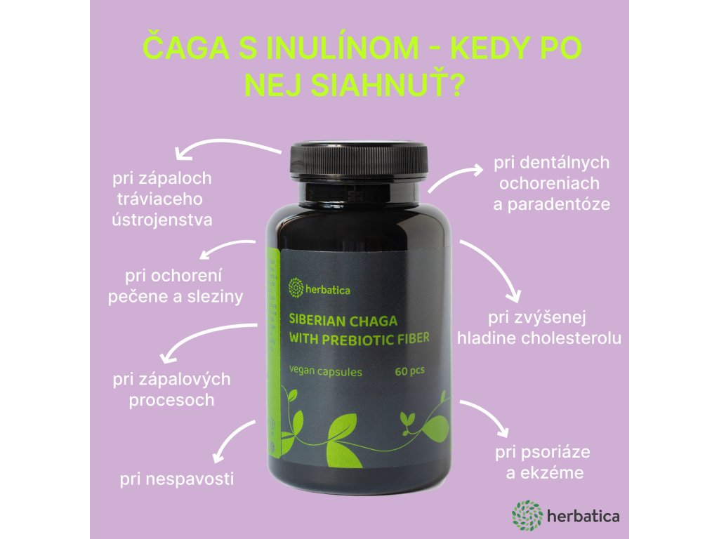 | Ingrediente: | sibirská čaga ( obsah v 1 kapsule 300 mg ), inulín ( obsah v 1 kapsule 100 mg ) Inulín = prebiotická rozpustná vláknina z koreňa čakanky podporujúca trávenie |
