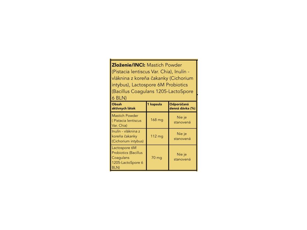 Ingrediente: | Mastich Powder (Pistacia lentiscus Var. Chia), Inulín - vláknina z koreňa čakanky (Cichorium intybus), Lactospore 6M Probiotics (Bacillus Coagulans 1205-LactoSpore 6 BLN) |