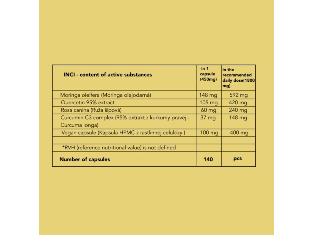 Ingrediente: | Moringa olejodarná (Moringa oleifera), Quercetin 95% extrakt, Ruža šípová (Rosa canina), Curcumin C3 complex 95% extrakt z kurkumy pravej (Curcuma longa), kapsula HPMC z rastlinnej celulózy. |